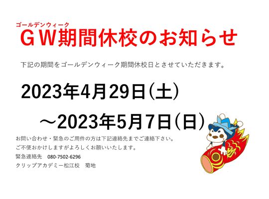 2022/04/27〈GW期間中の営業時間おしらせ〉 日頃よりお世話になっております。 クリップアカデミー松江校では4/30(土)~5/8(日)までの期間休校とさせていただきます。 ... -